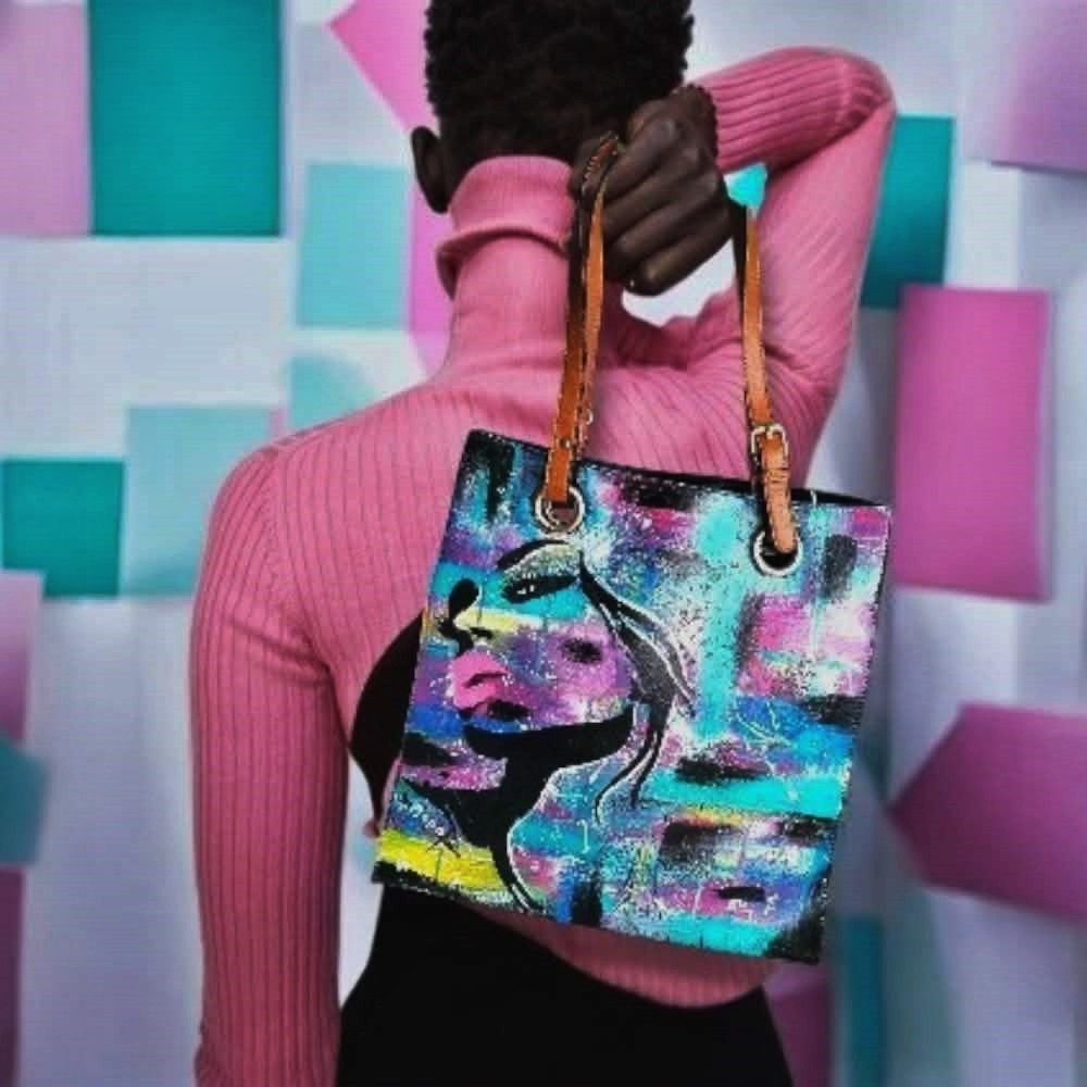Egyedi, kézzel festett női shopper táska vibráló színekkel és művészi arcmotívummal.