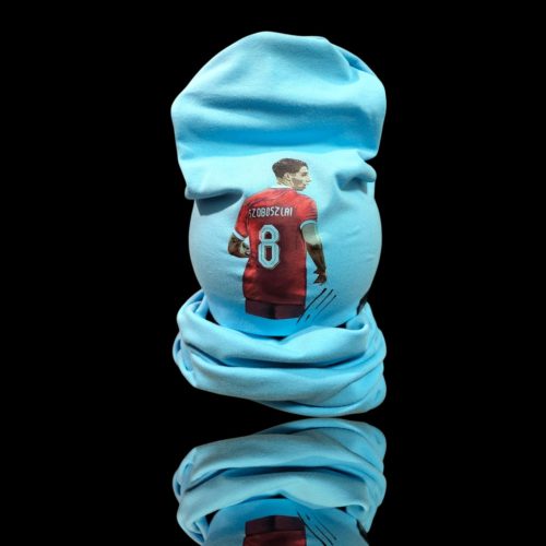 Türkiz sapi szett rugalmas kevertszálas pamut anyaggal bélelve elején Szoboszlai nyomott mintával